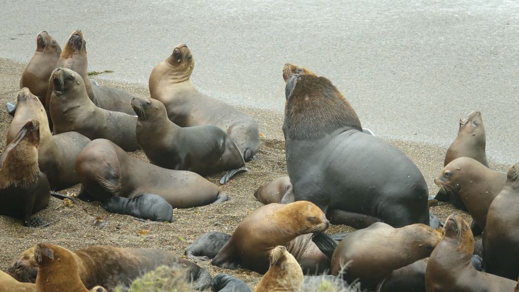 Die Nordetappe macht wieder richtig Spaß, zumal sich jetzt auch das Wetter gnädig zeigt. Die Temperatur steigt auf 19 Grad und die Sonne zeigt sich immer wieder in den Wolkenlücken. Kurz vor Erreichen der Punta del Norte meint noch ein Autofahrer, mich bei Tempo 95 auf der Schotterpiste überholen und einstauben zu müssen – da kennen die Südamerikaner ja kein Pardon! Aber ich lerne doch lieber von den Seeelefanten und zeige mit einem beherzten Dreh am Gasgriff, wer auf dieser Piste das Sagen hat!